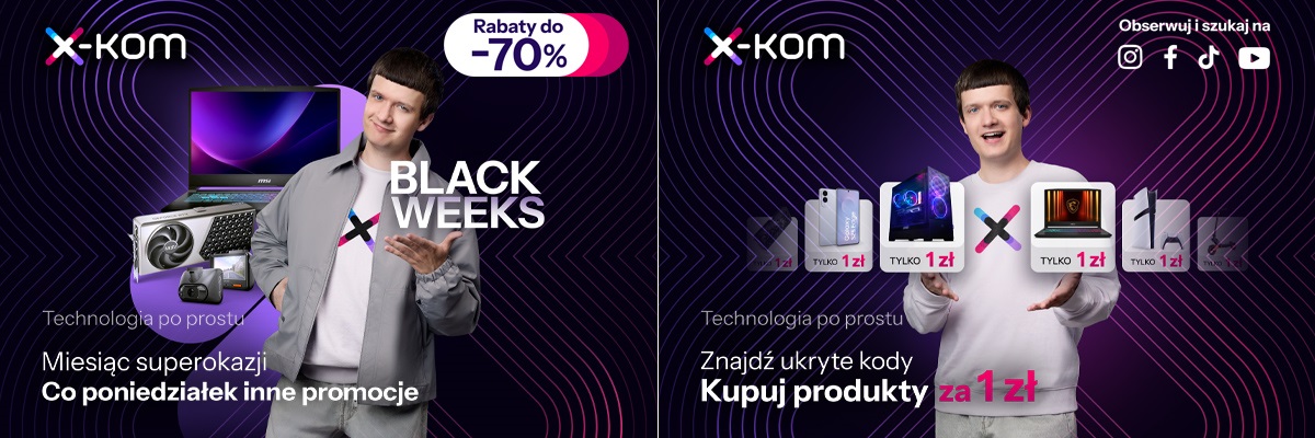 Podobnie jak rok temu w tegorocznej edycji Black Weeks x-kom całkowicie rezygnuje z kodów rabatowych. Każdy produkt w promocyjnej cenie można kupić bez dodatkowych warunków – wystarczy dodać go do koszyka i sfinalizować zakup. Wszystko zgodnie z duchem marki: prosto, intuicyjnie, bez zbędnych barier.