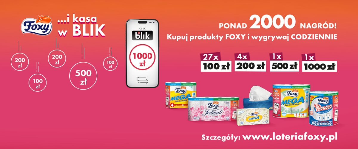 15 września 2025 r. startuje loteria „Foxy… i kasa w BLIK”! Każda rolka papieru Foxy to stanie się papierem wartościowym, który może zamienić się w gotówkę. Po zarejestrowaniu paragonu uczestnicy mają szansę na wygraną w postaci szybkiego przelewu BLIK. Codziennie do rozdania będzie około 30 nagród, w tym unikalna dzienna wygrana – 1000 zł. Loteria trwa do 14 listopada 2025 r.