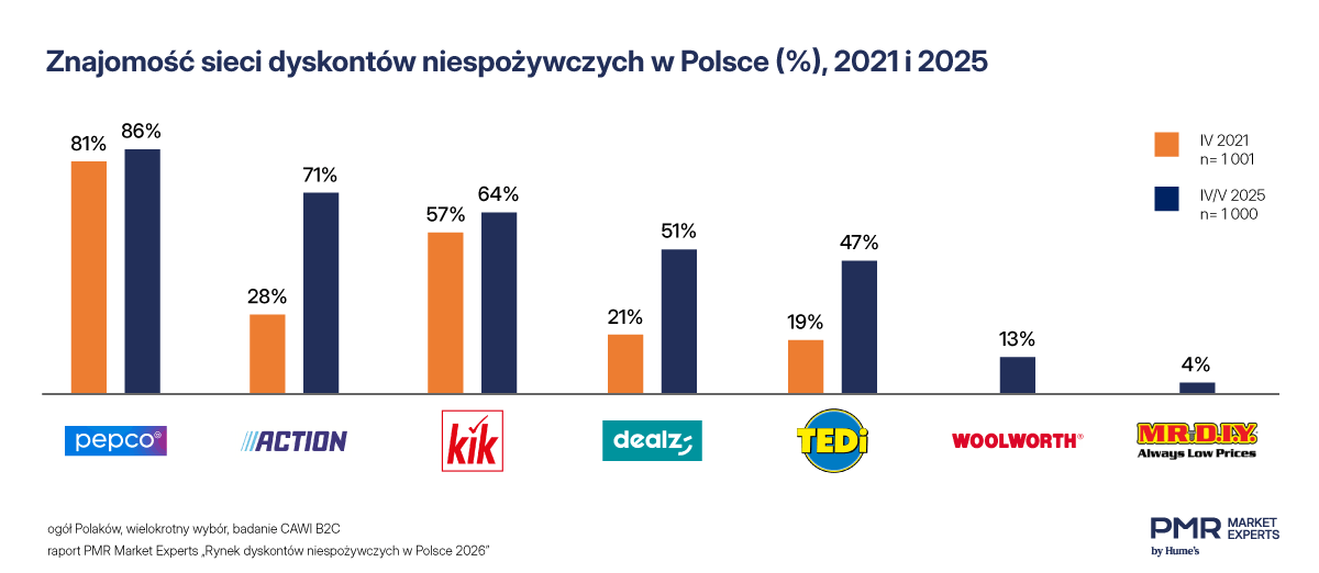 Ostatnie lata przyniosły wyraźny wzrost rozpoznawalności wszystkich sieci dyskontów niespożywczych w Polsce, przy czym najsilniejszą dynamikę notują gracze stosunkowo nowi na rynku. W 2025 roku znajomość sieci Action wśród konsumentów wzrosła do 71%, wobec 28% w 2021 roku. Podobny trend obserwowany jest w przypadku Dealz i TEDi, które w krótkim czasie znacząco zwiększyły swoją obecność w świadomości klientów. Jednocześnie to Pepco pozostaje najbardziej rozpoznawalnym i najczęściej wskazywanym przez konsumentów szyldem w segmencie, utrzymując pozycję lidera pod względem popularności, mimo wyhamowania tempa wzrostu sprzedaży.